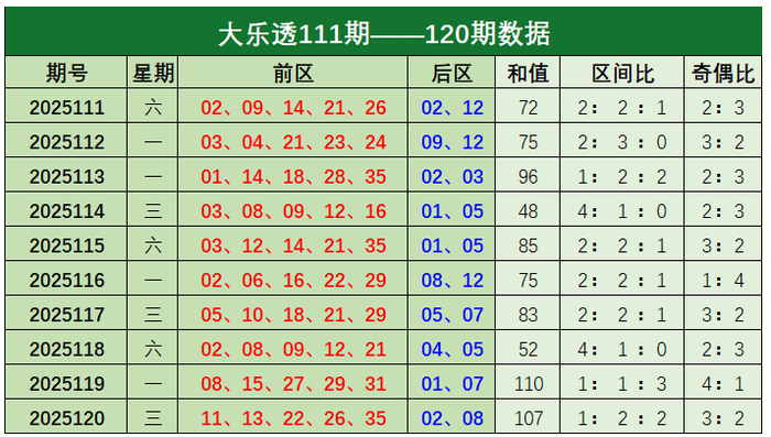 大乐透第2025120期出奖号统计:前区11、13、22、26、35,后区02、08。和值为107体育集锦,区间比为1:2:2,奇偶比为3:2。