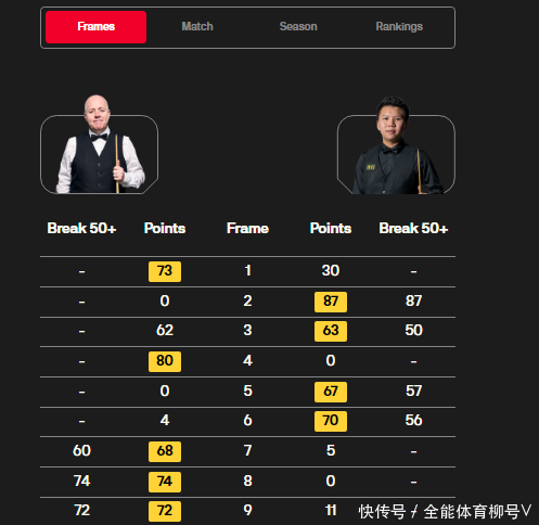 而后,两东谈主伸开拉锯战,胶著的比赛中,希金斯以73-30先胜一局,1-0超越。第二局,周跃龙在这一局开局领先上手得分,1-0、4-0、48-0,并以87-0扳平比分。