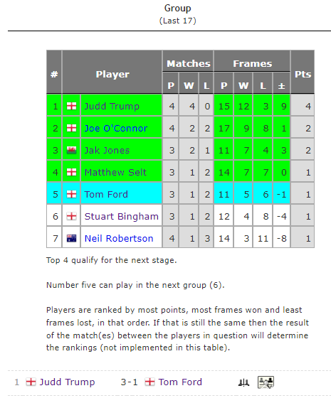 带着群众赛的若干缺憾,特鲁姆普、罗伯逊背靠背出战冠军联赛第五组的较量。他在小组轮回赛前四轮,以3-1、3-1、3-0、3-1的比分夺得四连胜体育录像/图片,而罗伯逊仅以1胜3负名次倒数第一。乔-奥康纳、杰克-琼斯、马修-塞尔特、斯图亚特-宾汉姆,分裂排在第二到第六。